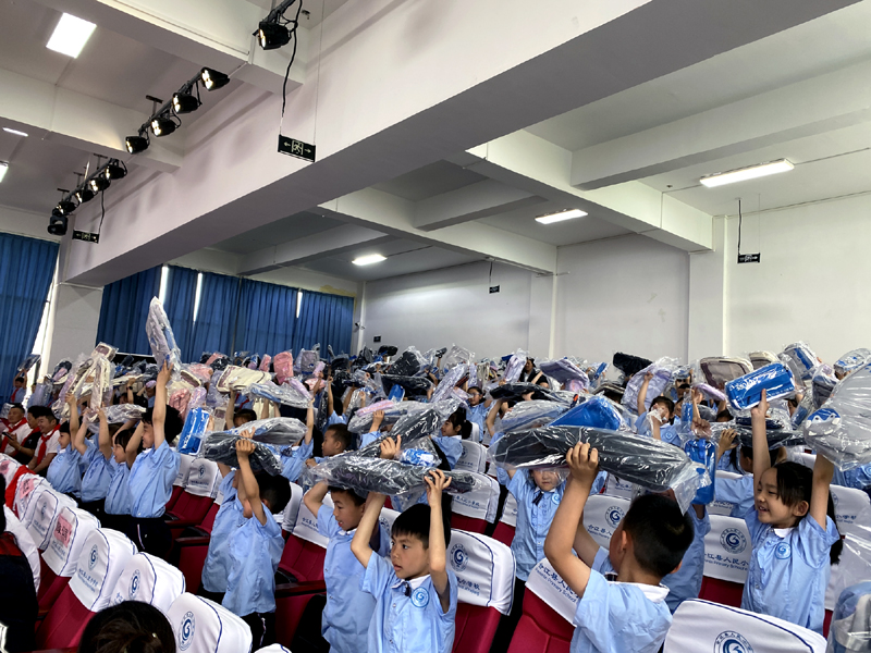 颁奖活动现场,300套天蓝色书包在主席台前筑起“知识长城”,李金龙作为爱心代表现场为孩子们发放“小书包”。