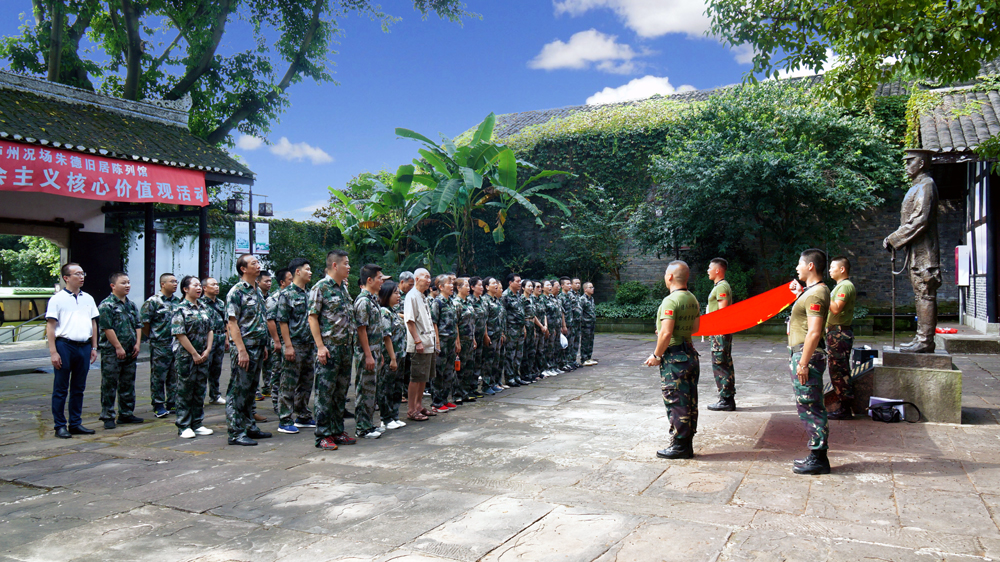 12日上午,60多名骨干会员来到泸州况场朱德纪念馆参观学习,怀念革命先辈,接受红色教育。在朱德将军铜像前,会员们举行了庄严的国旗瞻仰仪式。雄壮的乐曲声中,四名护旗手护卫着国旗,踏着豪迈有力的步伐走来。大家深情凝视国旗,高声齐唱国歌!