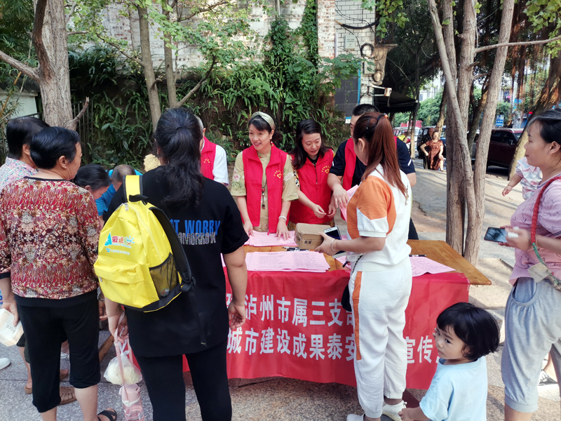 917日,泸州民建市属三支部基层共建“志愿者”小分队走进江阳区泰安街道,设立宣传点,向群众宣传泸州创文成果,开展创文知识问答等。