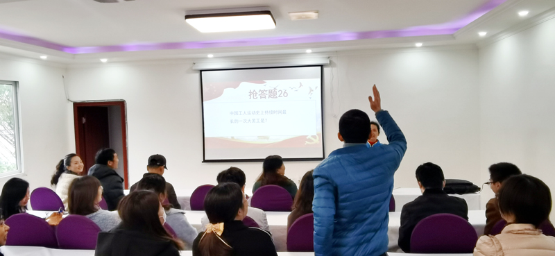 本次竞赛题目涵盖了“不忘初心、牢记使命”主题知识、习近平新时代中国特色社会主义思想内涵、《中国共产党章程》《中国共产党简史》等有关内容,设置了选择题、抢答题等。竞赛现场,全部会员分为两组进行比赛,队伍激烈角逐。抢答时选手们全神贯注、仔细聆听,生怕听掉了一个字,“请抢答”话音刚落,选手就举起手;团体赛加试时,选手们齐心协力,团结协作;互动答题中,现场观众积极参与。浓厚的竞赛氛围把本次活动推向高潮。